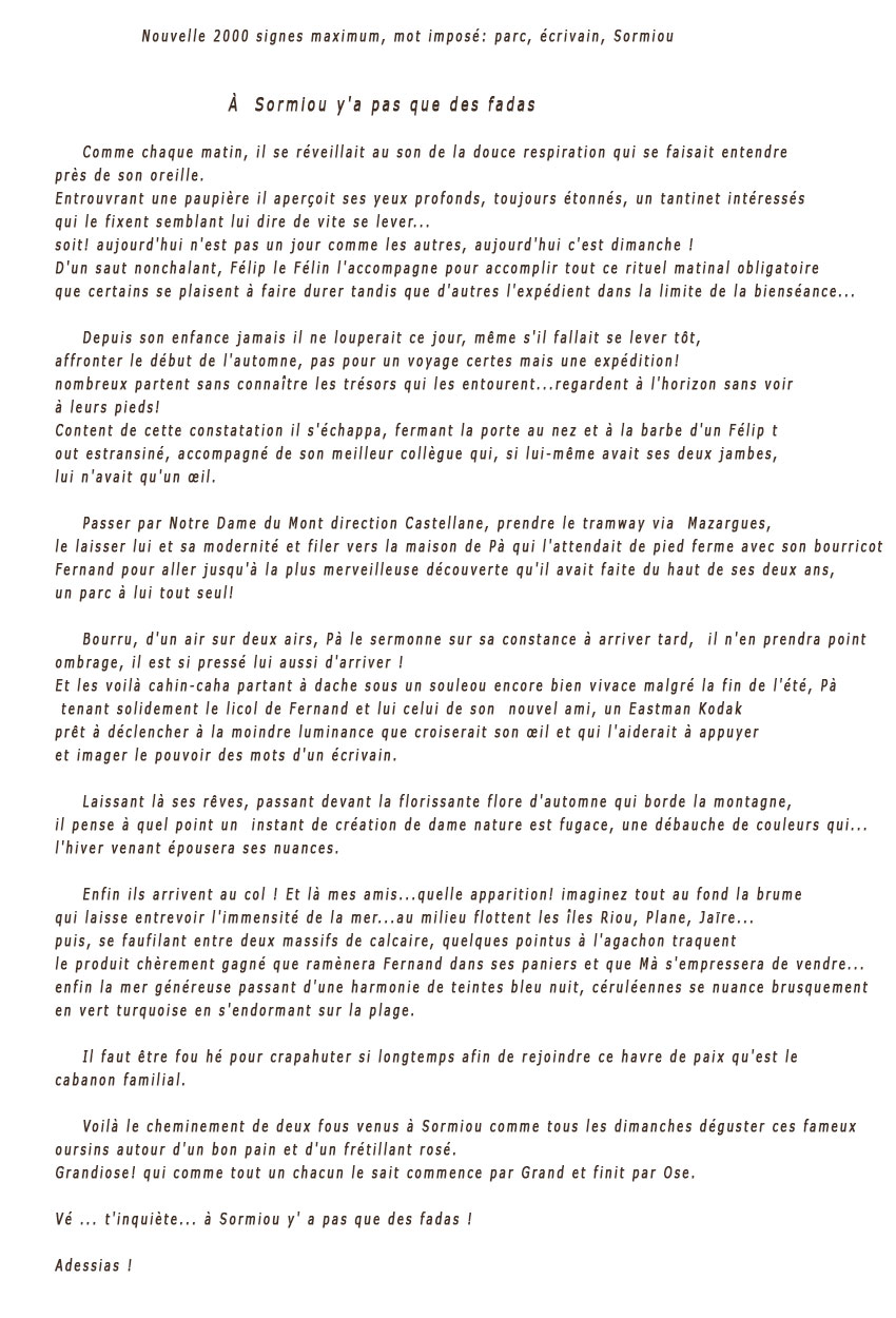 Plusieurs écrivains marseillais ont répondu au concours de nouvelle "Écrivains en capitale" avec un nombre de signe et trois mots imposés, premier prix pour " À Sormiou y'a pas que des fadas ! "...
