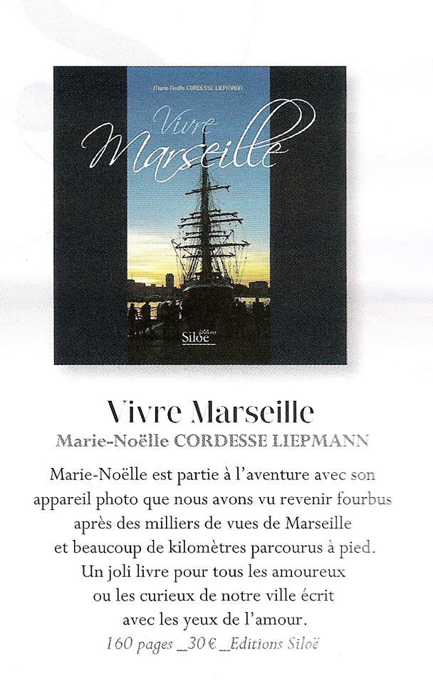 Passionnée par sa ville, voulant présenter Marseille sous une autre facette, plus vivante et surtout faire connaître ses quartiers dont on ne parle jamais dans les livres, elle l'a parcouru dans tout les sens. Ce qui a abouti à la parution en 3000 exemplaires par les éditions Siloé d'un livre " vivre Marseille", une balade dans tout les arrondissements alliant photos, historique et parlé marseillais.